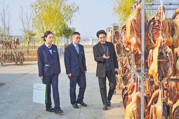1月8日,安徽省六安市固镇镇的腊鹅晾晒场里,一排排皖西腊鹅透着新春的烟火气。邮储银行六安市分行信贷客户经理上门向企业负责人了解腊鹅产销情况,详细询问养殖进度及资金运营需求,以精准服务为新春的“腊味经济”注入金融动能。 □李明 摄