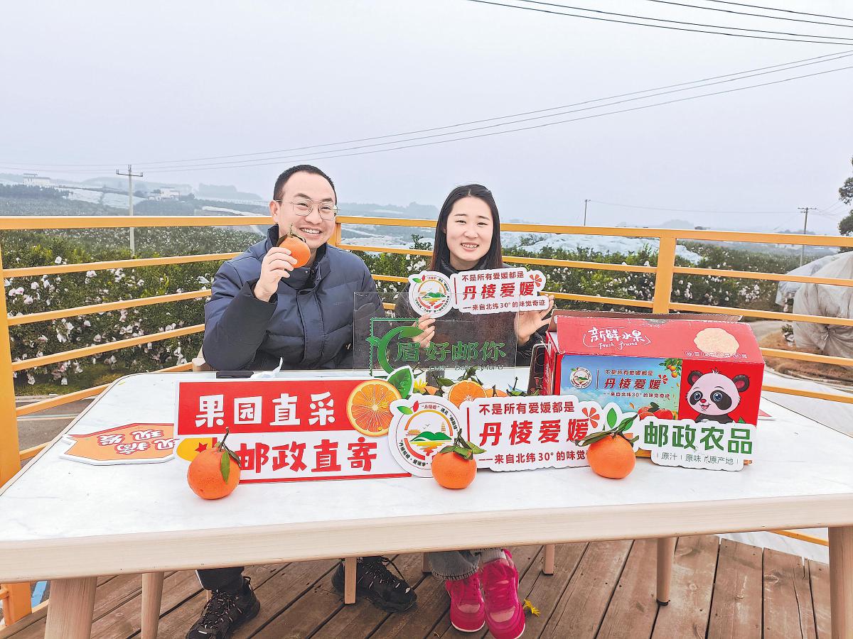 “眉好邮你”团队通过电商直播助销丹棱爱媛橙。 □邹凤 摄