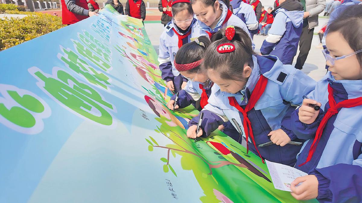江苏省南通市海门区邮政分公司联合海门街道城北社区、张謇小学开展“邮校传绿意 社区护新芽 童心植希望”主题实践活动。活动现场,孩子们齐声宣读“爱绿护绿”倡议书,联手绘制8米长“绿色画卷”,以稚嫩笔触勾勒青山绿水、鸟语花香的生态图景,随后投出“美丽海门”明信片,将绿色寄语寄往未来。□王欢 摄影报道
