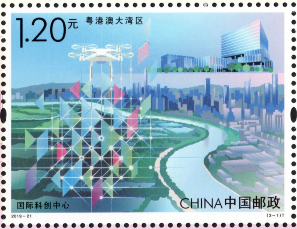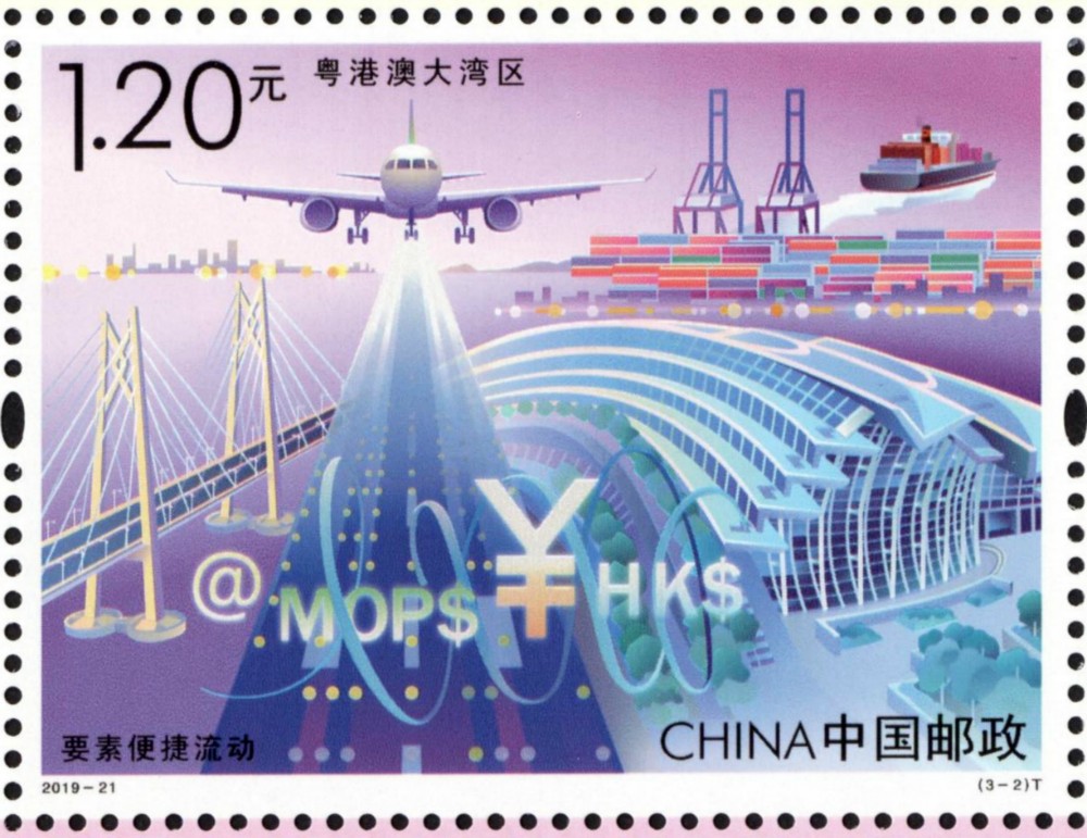 中国邮政定于2019年9月26日发行《粤港澳大湾区》特种邮票1套3枚,邮票图案名称分别为:国际科创中心、要素便捷流动、优质生活圈。全套邮票面值为3.60元。另发行小全张1枚,售价5.40元。